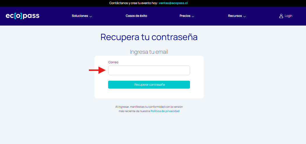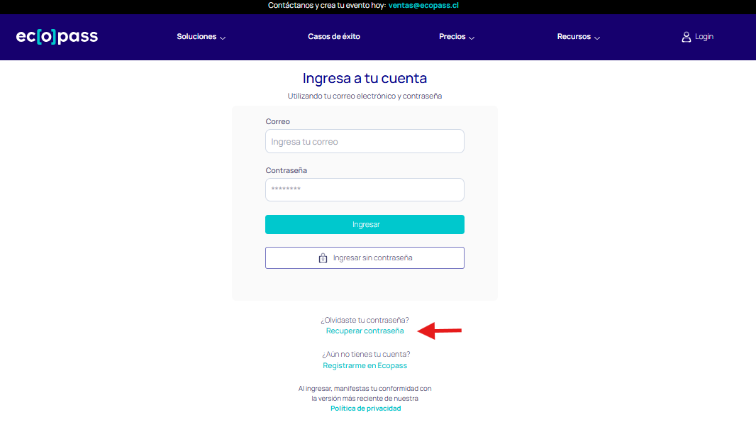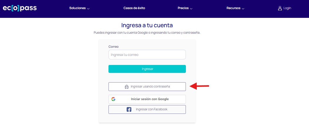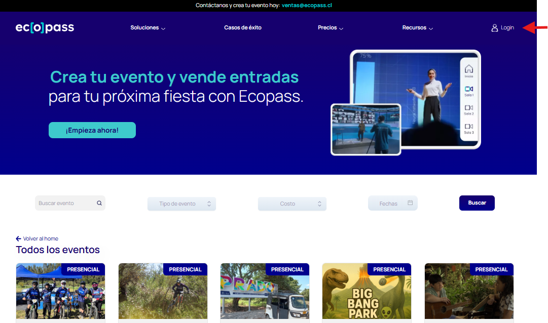- Ingresa a www.ecopass.cl y haz clic en “Login” (esquina superior derecha).