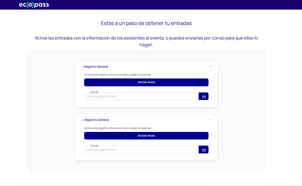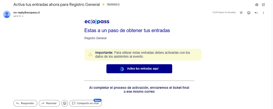 - Adicionalmente, debes saber que al finalizar tu compra recibirás un correo desde el cual podrás activar tus entradas en cualquier momento. Solo debes hacer clic en el botón "Activar entradas aquí" y serás redireccionado a la página de activación de entradas para ingresar los datos de tus asistentes.