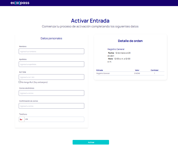 - Se desplegará una pantalla donde podrás activar cada entrada ingresando los datos de cada uno de los asistentes (Nombre, Apellido y RUT/DNI). Debes presionar el botón "Activar" para finalizar. Este proceso se debe realizar de forma individual por cada una de las entradas adquiridas.